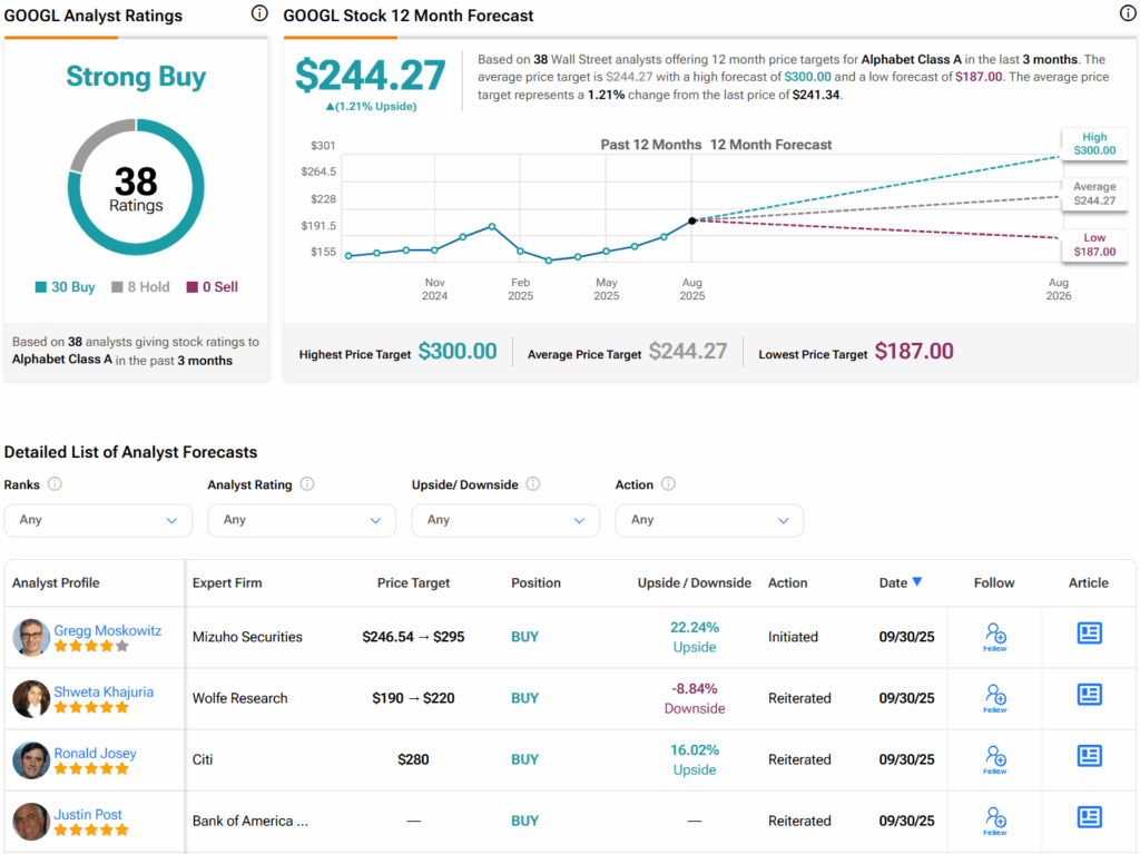 Turning to Wall Street, analysts have a Strong Buy consensus rating on GOOGL stock based on 30 Buys and eight Holds assigned in the past three months. Furthermore, the average GOOGL price target of $244.27 per share implies 1.2% upside potential.