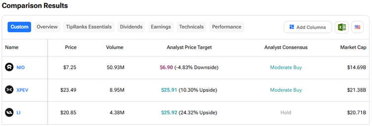 Using TipRanks’ Stock Comparison Tool, let’s look at Wall Street’s ratings on these three Chinese EV stocks.
