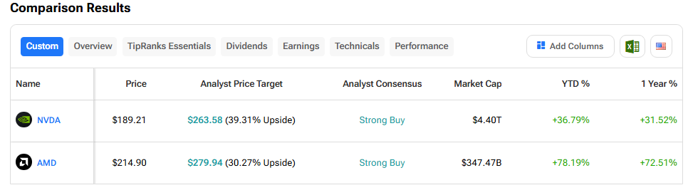 Both Nvidia and AMD carry a Strong Buy consensus rating from analysts. Based on current price targets, analysts see slightly higher upside for Nvidia, with about 39% upside, compared with roughly 30% upside for AMD.