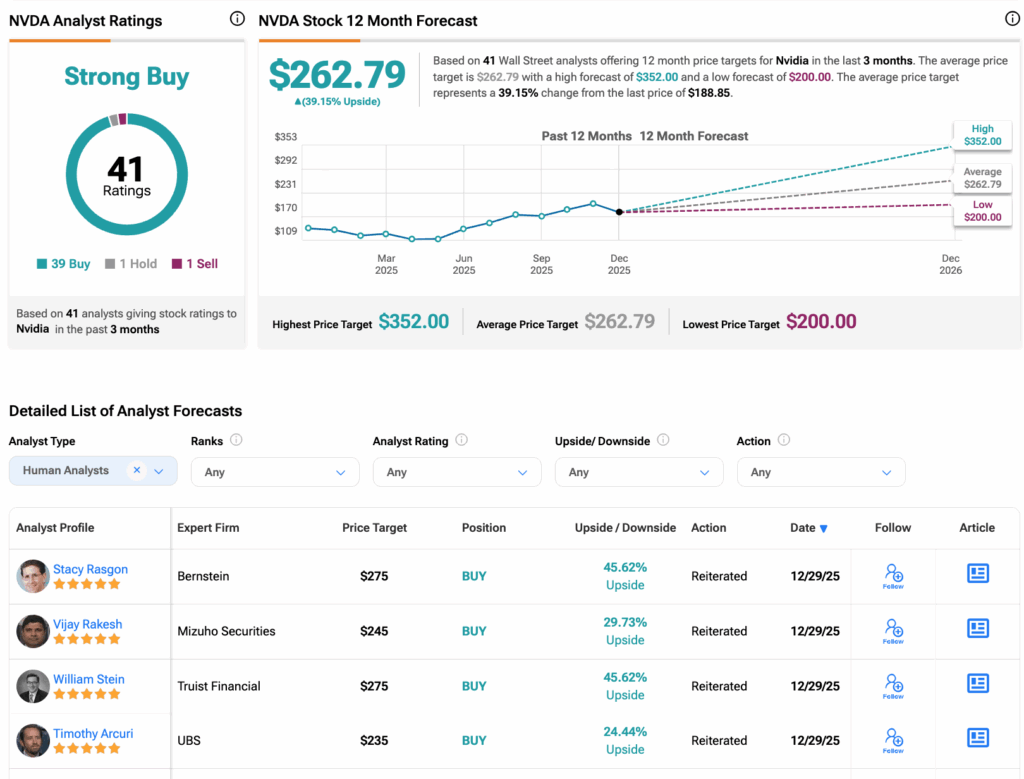 According to TipRanks, NVDA stock has a Strong Buy consensus rating based on 39 Buys, one Hold, and one Sell assigned in the last three months. At $262.79, Nvidia’s average share price target implies a 19% upside potential.