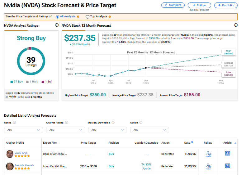 The stock of Nvidia has a consensus Strong Buy rating among 39 Wall Street analysts. That rating is based on 37 Buy, one Hold, and one Sell recommendations issued in the past three months. The average NVDA price target of $237.35 implies 18.13% upside from current levels.