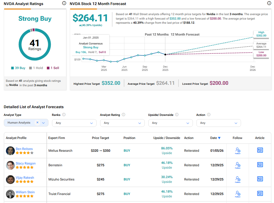 According to TipRanks, NVDA stock has a Strong Buy consensus rating based on 39 Buys, one Hold, and one Sell assigned in the last three months. At $264.11, Nvidia’s average share price target implies a 40% upside potential.