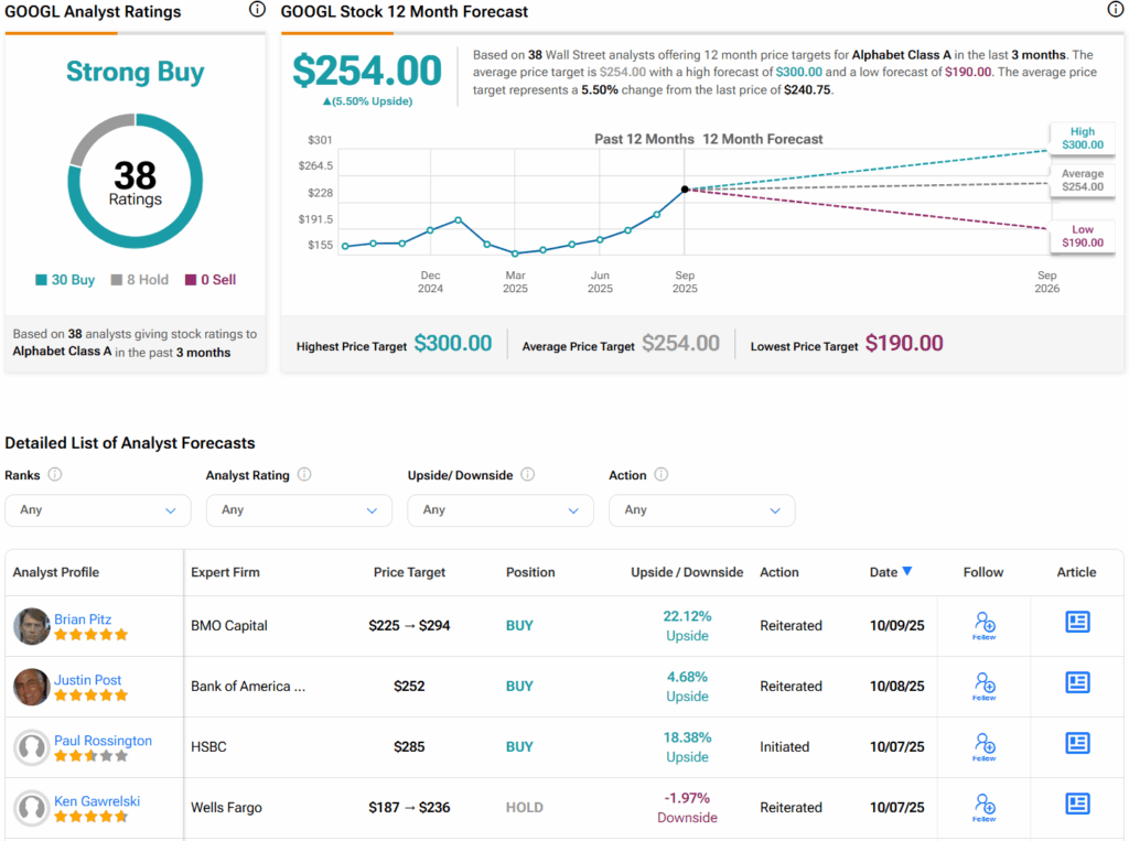 Turning to Wall Street, analysts have a Strong Buy consensus rating on GOOGL stock based on 30 Buys and eight Holds assigned in the past three months. Furthermore, the average GOOGL price target of $254 implies 5.5% upside potential.