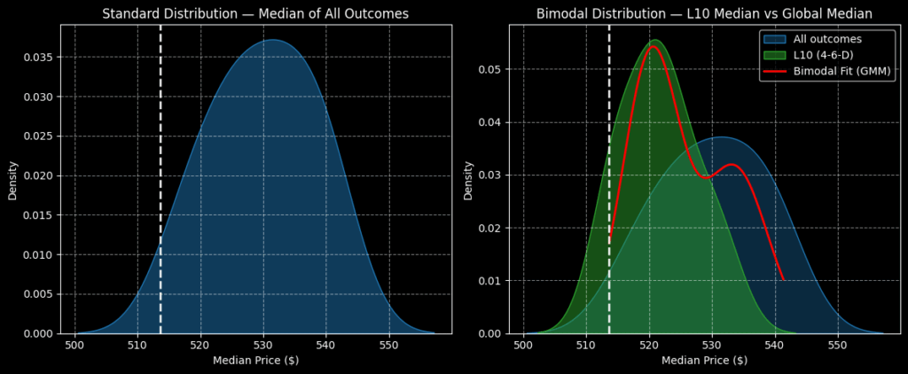 From one perspective, bullish investors would be pleased to note that prices would be expected to cluster between $520 and $540 over the next 10 weeks as the most common statistical outcome. So long as the buy-in point is below the bottom of this range, there’s a good chance of profitability.