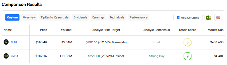 Artificial intelligence (AI) stocks continue to be in focus amid robust spending by hyperscalers and other tech giants. However, there are concerns on the valuation front, as not all companies are capturing AI-led growth opportunities to the same extent and justifying their lofty multiples. Using TipRanks’ Stock Comparison Tool, we will place Palantir Technologies (PLTR) and Nvidia (NVDA) against each other to find the better AI stock, according to Wall Street analysts.