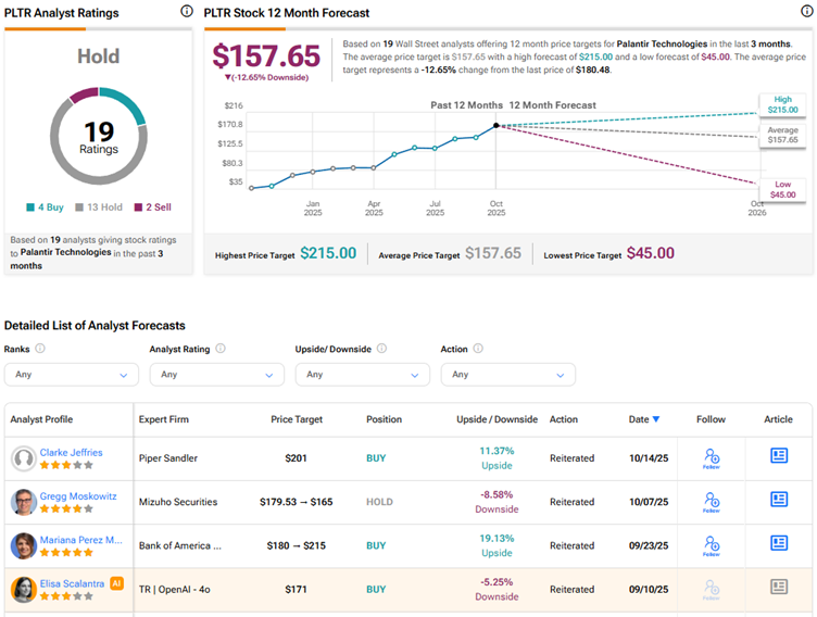 Unlike Jeffries, several analysts are cautious about Palantir Technologies stock. Overall, Palantir stock scores Wall Street’s Hold consensus rating based on four Buys, 13 Holds, and two Sell recommendations. The average PLTR stock price target of $157.65 indicates a possible downside of 12.7% from current levels.