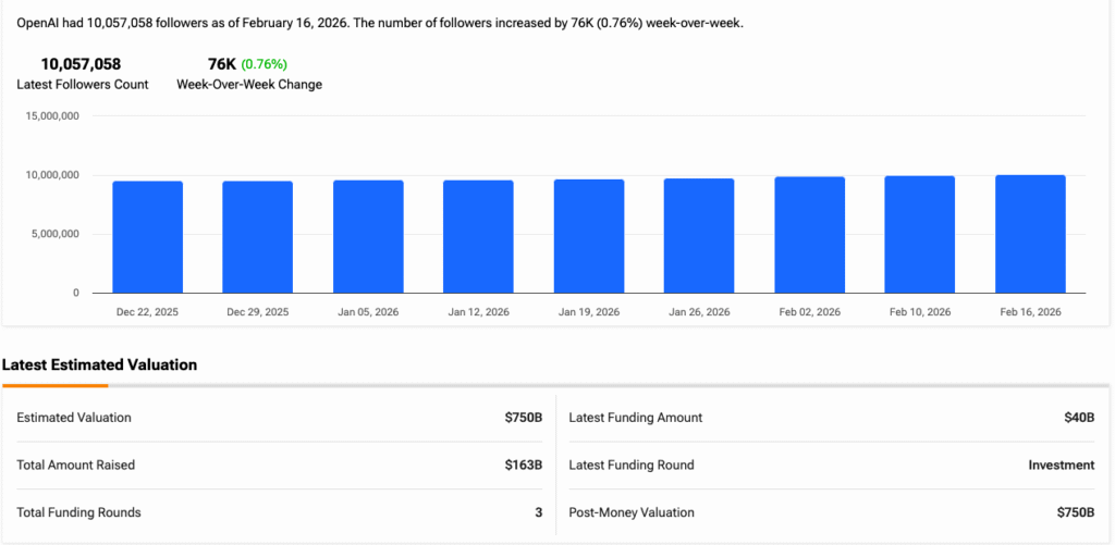 According to TipRanks private company center, OpenAI has an estimated valuation of $750 billion, putting it ahead of many private AI companies. However, SpaceX currently ranks higher, with an estimated market value of $2 trillion.