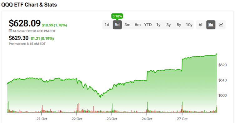 The QQQ ETF, which tracks the performance of the Nasdaq 100 Index (NDX), rose 1.78% on Monday, as the broader market rallied, driven by potential U.S.–China trade truce, strong corporate earnings, and expectations of an interest rate cut.
