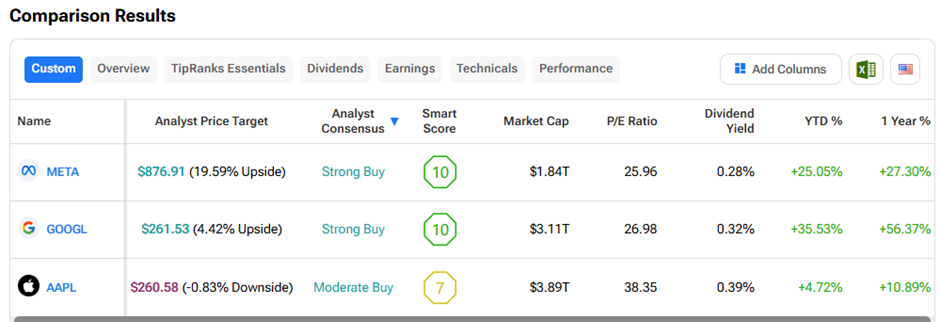 We used the TipRanks Stock Comparison Tool to determine which is the better tech stock, according to analysts. Currently, META and GOOGL stocks have a “Strong Buy” consensus rating, with META offering a higher upside potential over the next twelve months.