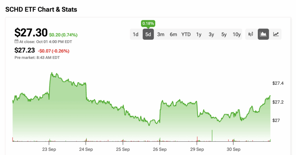 How is SCHD stock faring? The Schwab U.S. Dividend Equity ETF is up 0.18% over the past five days but up 2.03% year-to-date.