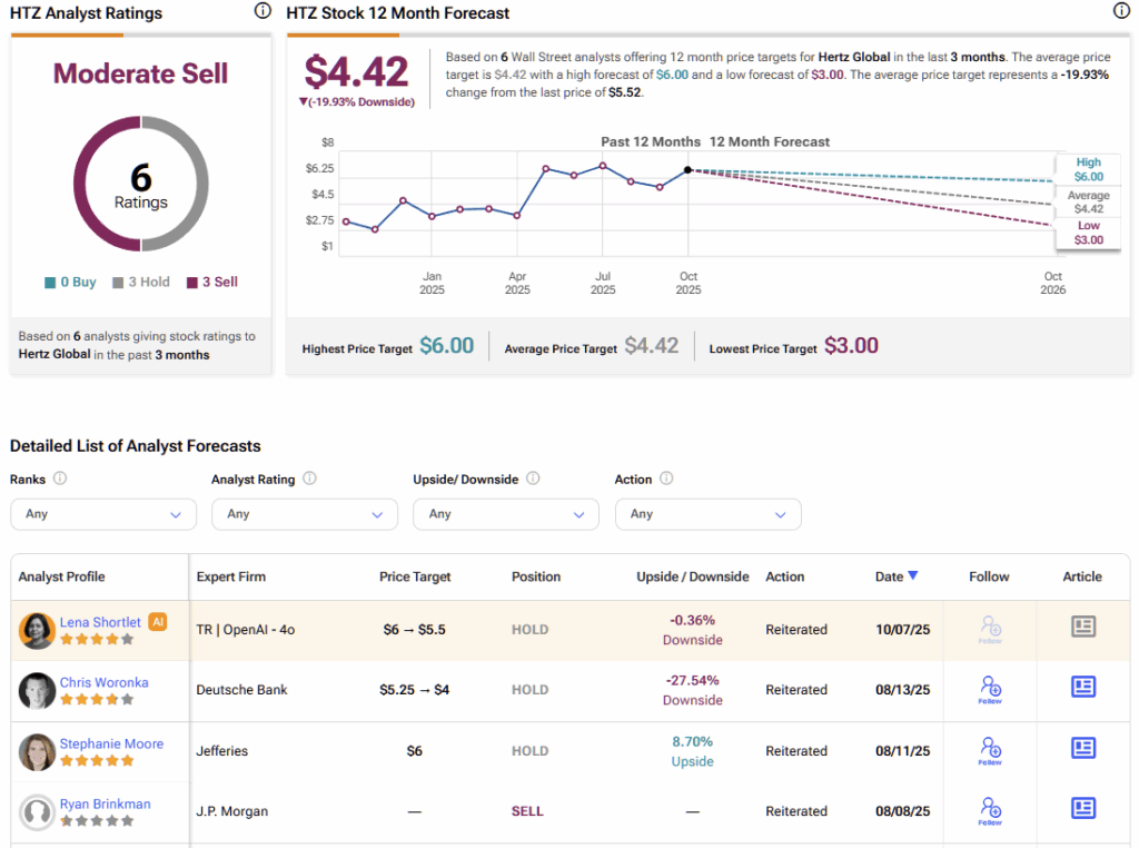 Turning to Wall Street, HTZ stock carries a Moderate Sell consensus rating based on zero Buys, three Holds, and three Sell ratings over the past three months. The average HTZ stock price target is $4.42, implying almost 20% downside risk over the coming year.