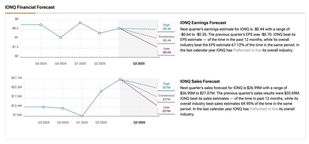 Wall Street analysts expect IonQ to report negative EPS (earnings per share) of $0.44 for Q3, compared to negative EPS of $0.24 in the same quarter last year. On the other hand, analysts project Q3 revenues to grow over 100% year-over-year to $26.9 million, according to the IONQ’s TipRanks Analyst Forecasts Page.