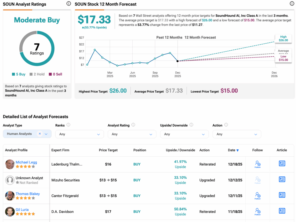 According to TipRanks, SOUN stock has received a Moderate Buy consensus rating, with five Buys and two Holds assigned in the last three months. The average SoundHound stock price target is $17.33, suggesting a potential upside of 53.7% from the current level.