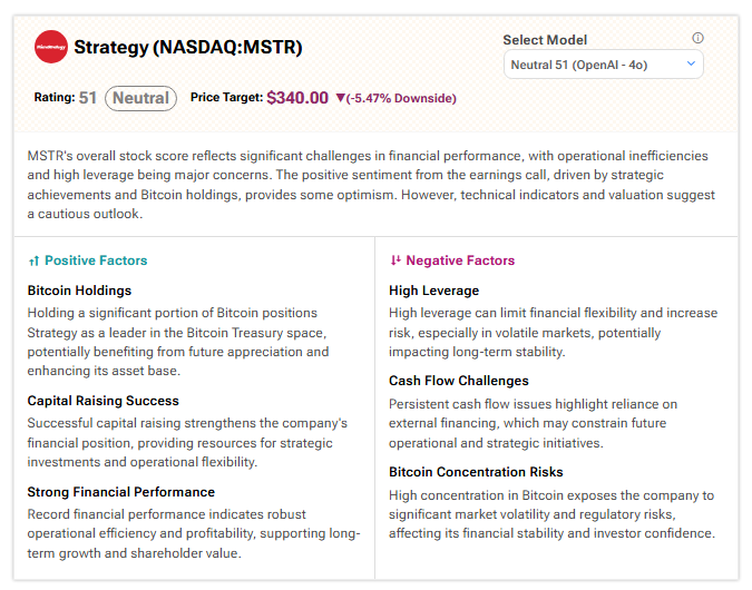 According to TipRanks’ AI Stock Analysis, MSTR stock scores a Neutral rating with a price target of $340, which indicates a possible downside of 5.47% from current levels. The AI score is 51 out of 100, which reflects mixed fundamentals and ongoing financial challenges.