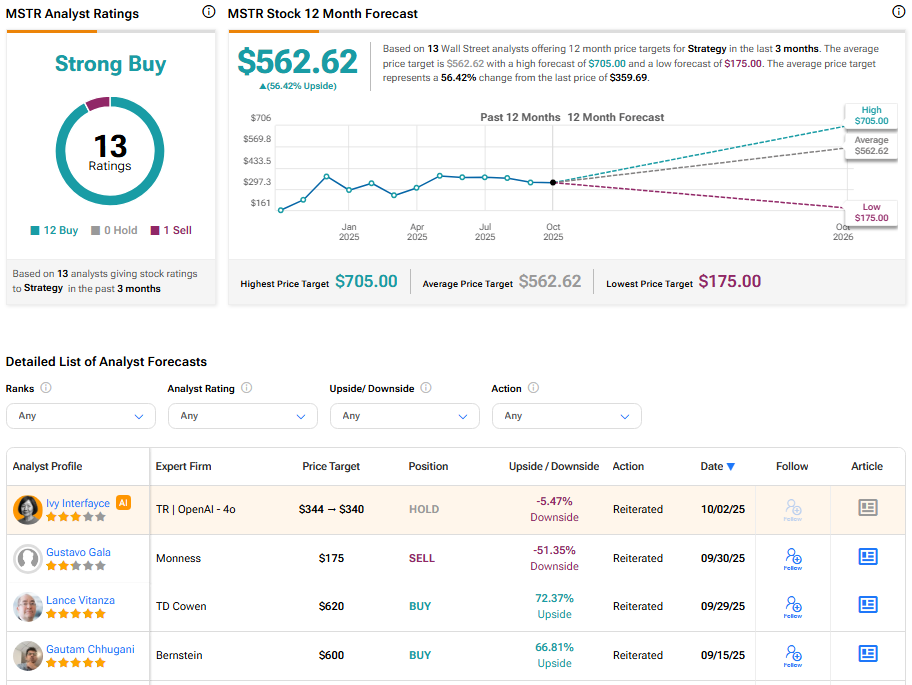 Turning to Wall Street, analysts have a Strong Buy consensus rating on MSTR stock based on 12 Buys, zero Holds, and one Sell assigned in the past three months, as indicated by the graphic below. Furthermore, the average MSTR price target of $562.62 per share implies 56.42% upside potential.