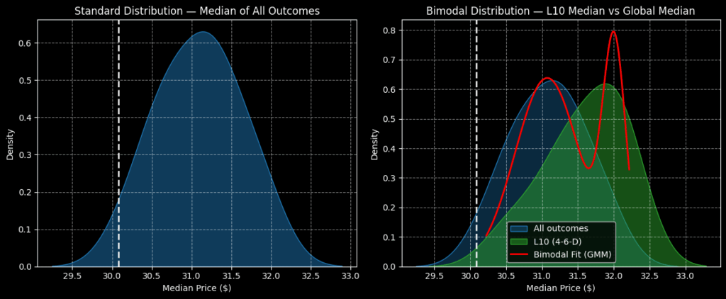 Using this approach, the forward 10-week returns for SMCI stock, based on a dataset that dates back to January 2019, are typically expected to range from $29.30 to $32.90 (assuming an anchor price of $30.08, Monday’s close). To be clear, this projection does not mean that SMCI is guaranteed to land within this distribution; just that this is the most likely distribution based on hundreds of rolling 10-week samples.