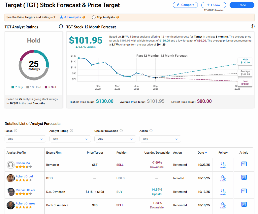 Target stock has a consensus Hold rating among 25 Wall Street analysts. That rating is based on seven Buy, 13 Hold, and five Sell recommendations issued in the last three months. The average TGT price target of $101.95 implies 8.17% upside from current levels.