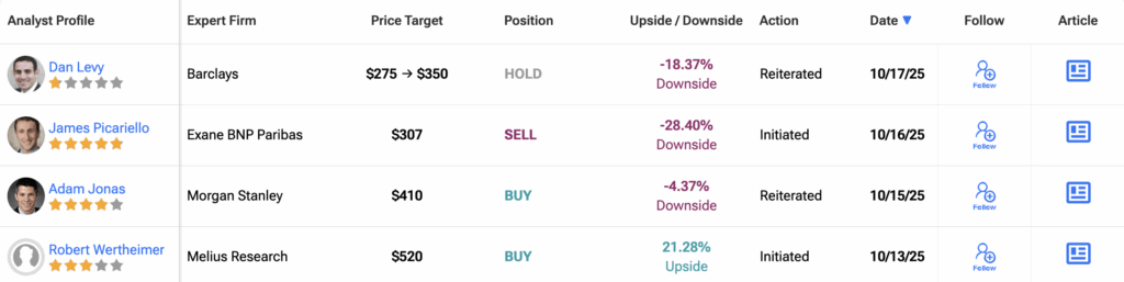 Adding fuel to the sell-off, BNP Paribas analyst James Picariello initiated coverage with a Sell rating and a stark $307 price target. This implies a 27% downside from current levels. According to Picariello, Tesla’s trillion-dollar-plus market cap is being propped up largely by expectations for its artificial intelligence businesses—robo-taxis and humanoid robots—which currently generate zero revenue.
