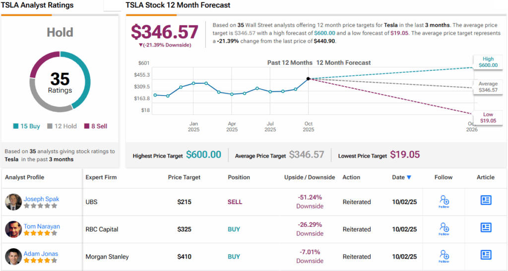 Most on the Street are far less bullish; TSLA stock claims a Hold (i.e., Neutral) consensus rating, based on a mix of 12 Holds, 15 Buys and 8 Sells. Meanwhile, the forecast calls for a 12-month drop of 21%, considering the average price target stands at $346.57. (See TSLA stock forecast)