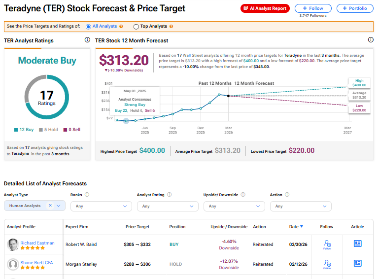 Teradyne’s stock has a consensus Moderate Buy rating among 17 Wall Street analysts. That rating is based on 12 Buy and five Hold recommendations issued in the last three months. The average TER price target of $313.20 implies 10% downside from current levels.