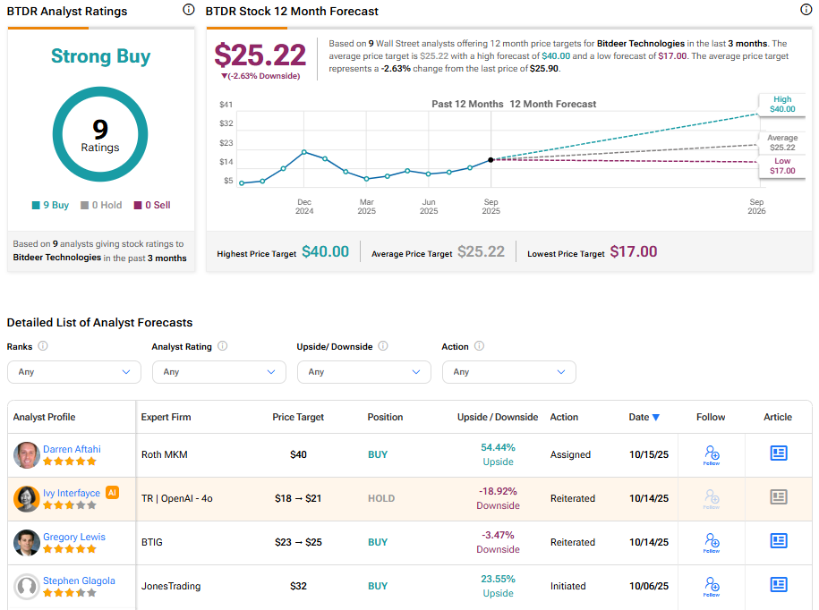 Turning to Wall Street, BTDR stock has a Strong Buy consensus rating based on nine unanimous Buys assigned in the last three months. At $25.22, the average Bitdeer stock price target implies a 2.63% downside risk.
