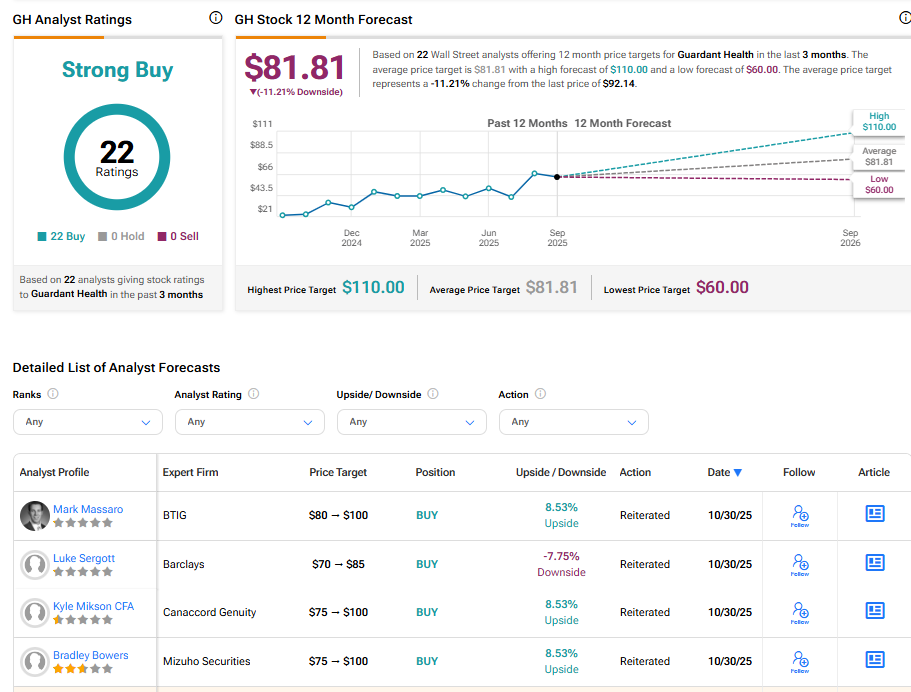 Currently, Wall Street has a Strong Buy consensus rating on GH stock based on 22 unanimous Buys assigned in the past three months. The average Guardant Health stock price target of $81.81 indicates an 11.21% downside risk from current levels.