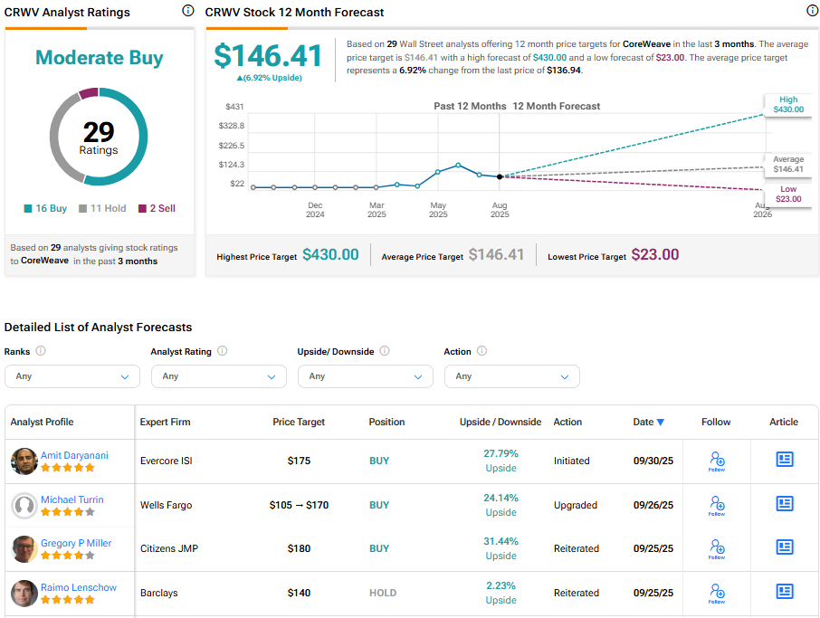 Turning to Wall Street, analysts have a Moderate Buy consensus rating on CRWV stock based on 16 Buys, 11 Holds, and two Sells assigned in the past three months. Further, the average CoreWeave stock price target of $146.41 per share implies 6.9% upside potential.