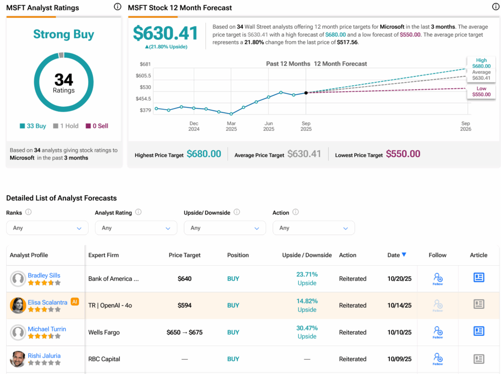 Turning to Wall Street, analysts have a Strong Buy consensus rating on MSFT stock based on 33 Buys and one Hold assigned in the past three months, as indicated by the graphic below. After a 22.64% rally in its share price over the past year, the average MSFT price target of $630.41 per share implies 21.8% upside potential.