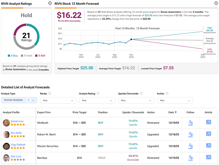 Currently, Wall Street has a Hold consensus rating on Rivian Automotive stock based on eight Buys, eight Holds, and five Sell recommendations. The average RIVN stock price target of $16.22 indicates 22.4% downside risk.