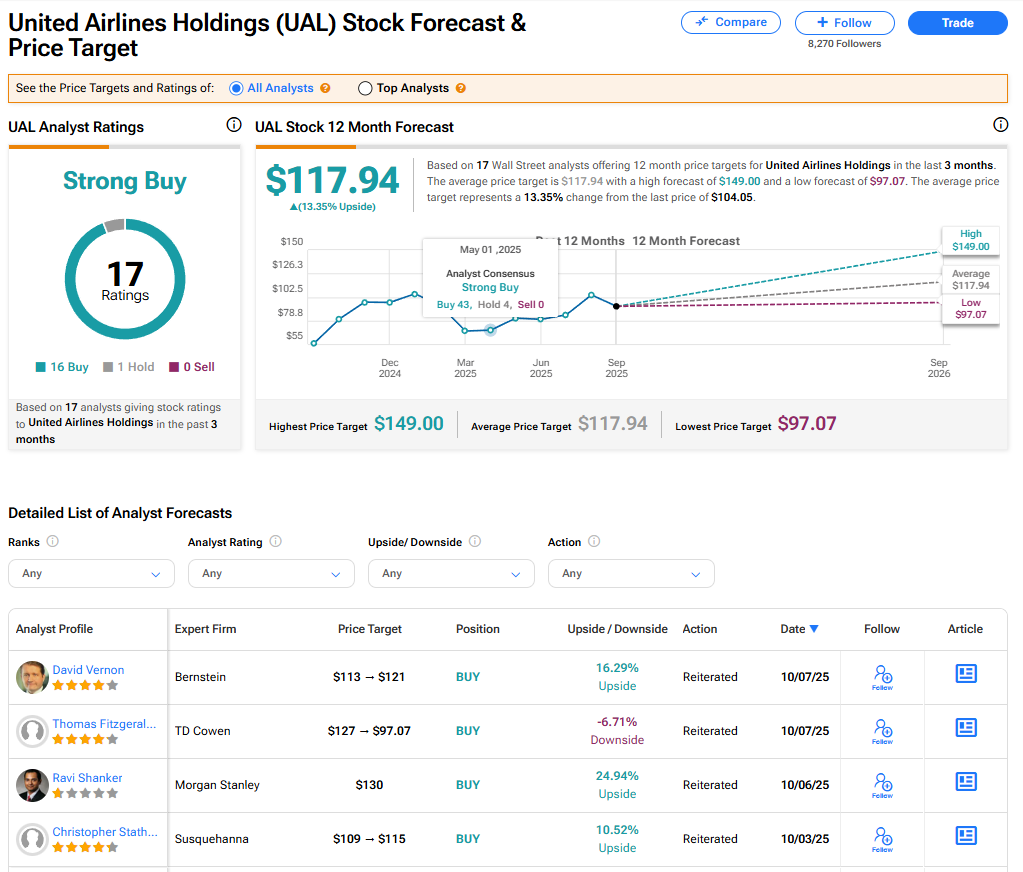 The stock of United Airlines has a consensus Strong Buy rating among 17 Wall Street analysts. That rating is based on 16 Buy and one Hold recommendations issued in the last three months. The average UAL price target of $117.94 implies 13.35% upside from current levels. These ratings are likely to change after the company’s financial results.
