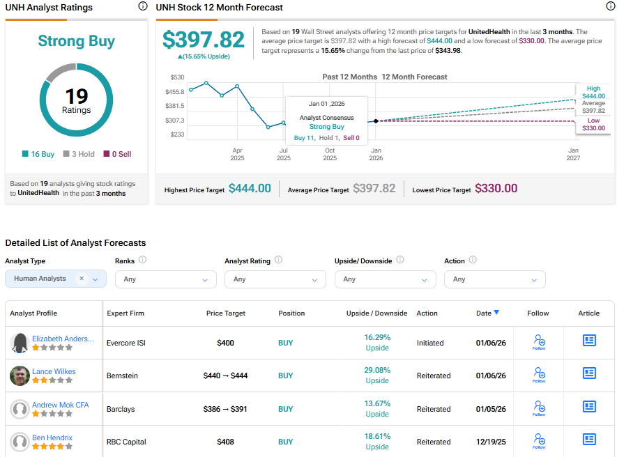 Overall, Wall Street has a Strong Buy consensus rating on UnitedHealth stock based on 16 Buy and three Hold recommendations. The average UNH stock price target of $397.82 indicates 15.65% upside potential.
