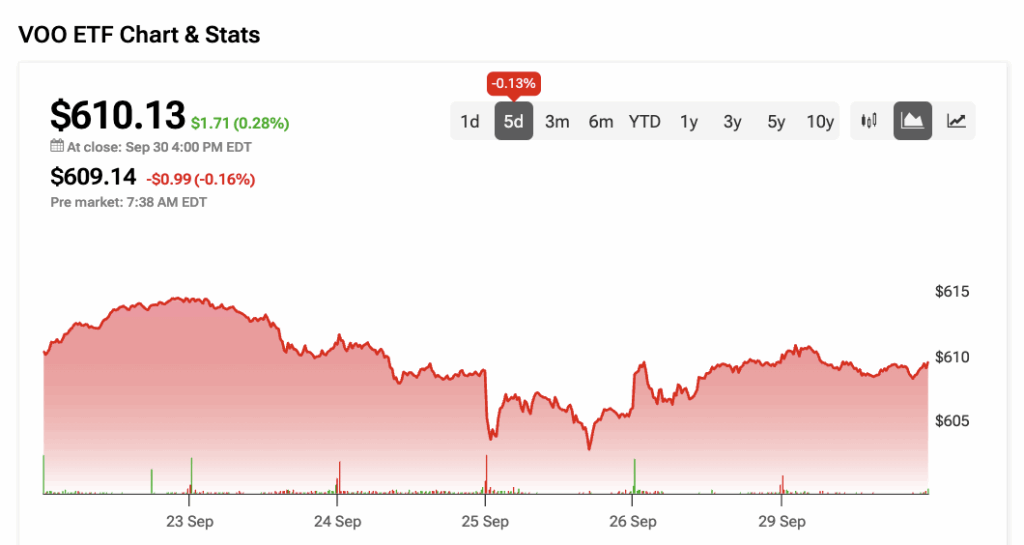 How is VOO stock faring? The Vanguard S&P 500 ETF is down 0.13% in the past five days but up 13.98% year-to-date.