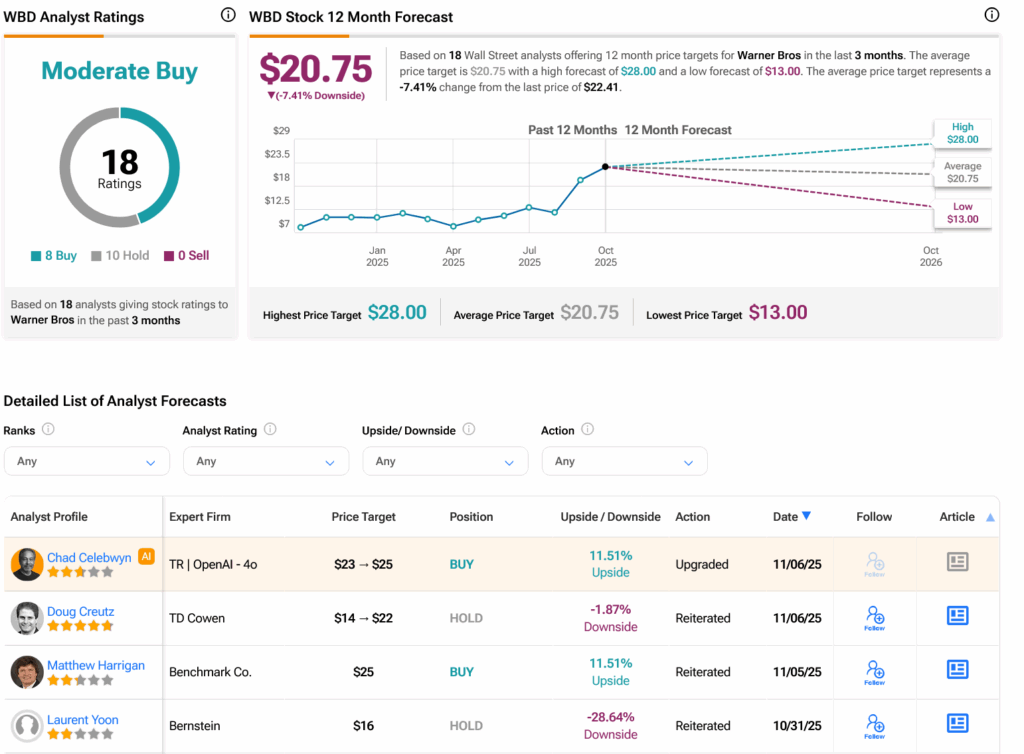 Turning to Wall Street, analysts have a Moderate Buy consensus rating on WBD stock based on eight Buys and 10 Holds assigned in the past three months, as indicated by the graphic below. After a 142.9% rally in its share price over the past year, the average WBD price target of $20.75 per share implies 7.41% downside risk.