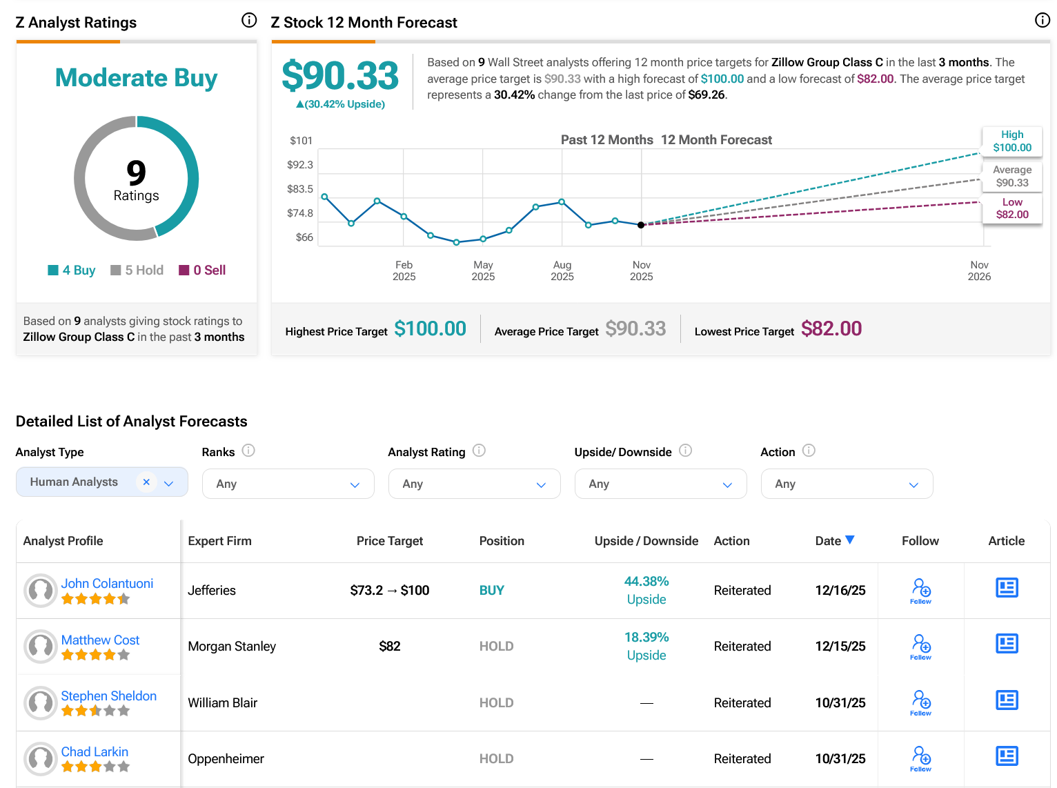 Turning to Wall Street, analysts have a Moderate Buy consensus rating on Z stock based on three Buys and two Holds assigned in the past three months, as indicated by the graphic below. After a 10.04% loss in its share price over the past year, the average Z price target of $90.33 per share implies 30.42% upside potential.