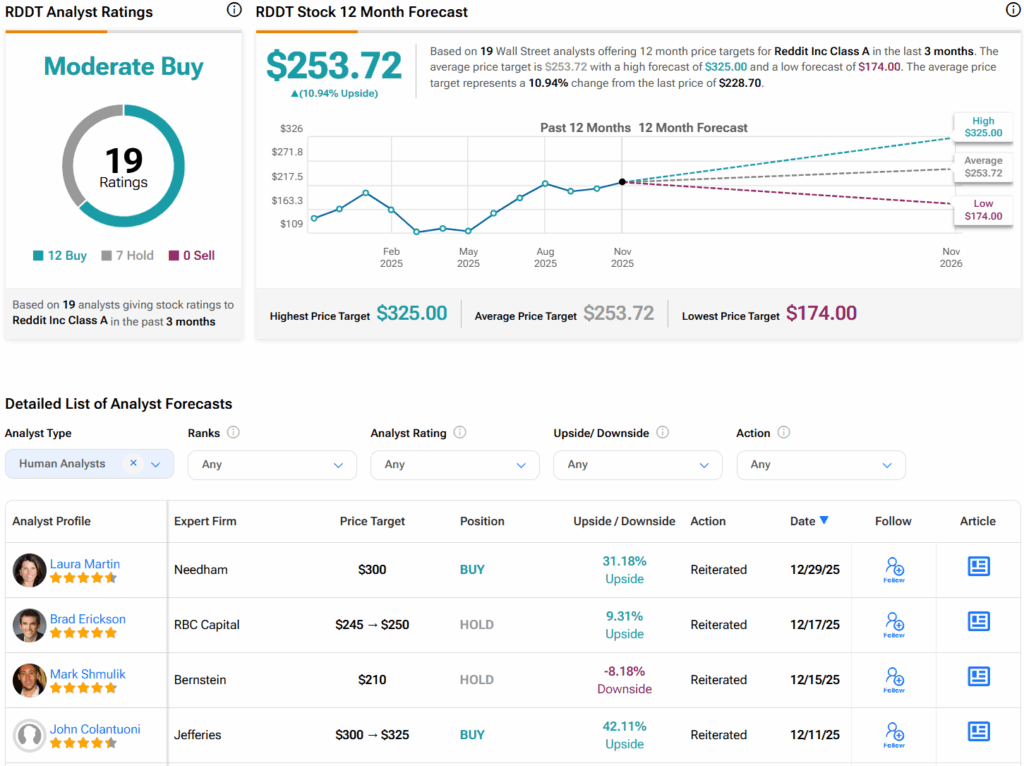 Turning to Wall Street, analysts have a Moderate Buy consensus rating on RDDT stock based on 12 Buys, seven Holds, and zero Sells assigned in the past three months, as indicated by the graphic below. Furthermore, the average RDDT price target of $253.72 per share implies 11% upside potential.