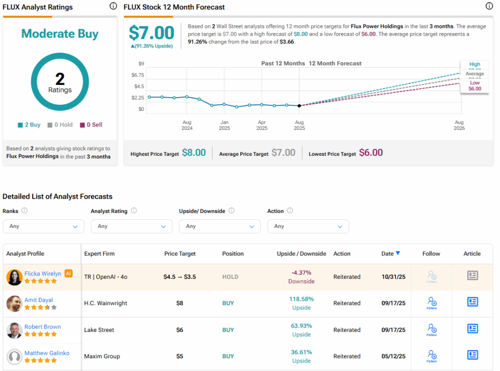 Turning to Wall Street, the analysts’ consensus rating for Flux Power is Moderate Buy, based on two Buy ratings over the past three months. With that comes an average FLUX stock price target of $7, representing a potential 91.26% upside for the shares.