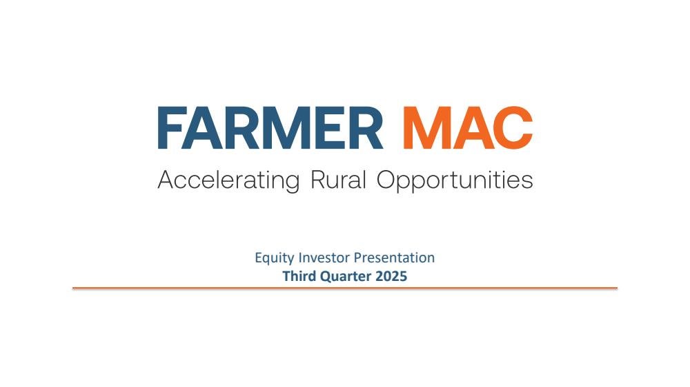 Federal Agricultural Mortgage Corporation provides a secondary market for various loans made to borrowers in the United States. It operates through four segments: Farm & Ranch, USDA (United States Department of Agriculture) Guarantees, Rural Utilities, and Institutional Credit. The Farm & Ranch segment purchases and retains eligible mortgage loans that are secured by first liens on agricultural real estate; securitizes eligible mortgage loans, and guarantees the timely payment of principal and interest on securities representing interests in or obligations secured by pools of mortgage loans; and issues long-term standby purchase commitments (LTSPC) on designated eligible mortgage loans. The USDA Guarantees segment purchases portions of certain agricultural and rural development loans guaranteed by the USDA. The Rural Utilities segment purchases and guarantees securities that are backed by loans for electric or telecommunications facilities by lenders organized as cooperatives to borrowers; and purchases eligible rural utilities loans and guarantees of securities backed by those loans, as well as LTSPCs for pools of eligible rural utilities loans. The Institutional Credit segment guarantees and purchases general obligations of lenders and other financial institutions that are secured by pools of loans eligible under the Farmer Mac's Farm & Ranch, USDA Guarantees, or Rural Utilities lines of business. Federal Agricultural Mortgage Corporation was founded in 1987 and is headquartered in Washington, District of Columbia.