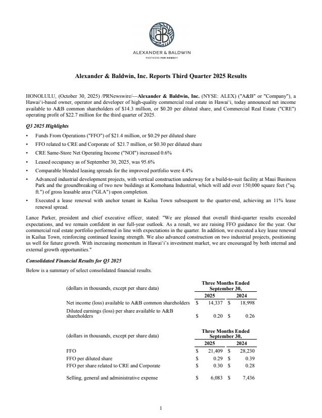 Alexander & Baldwin, Inc. released its earnings results on Oct 30, 2025. The company reported $0.2 earnings per share for the quarter, beating the consensus estimate of $0.14 by $0.06.