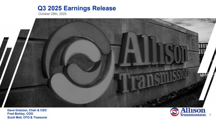 Allison Transmission Holdings, Inc., together with its subsidiaries, designs, manufactures, and sells commercial and defense fully-automatic transmissions for medium-and heavy-duty commercial vehicles, and medium-and heavy-tactical U.S. defense vehicles worldwide. It offers transmissions for various applications, including distribution, refuse, construction, fire, and emergency on-highway trucks; school and transit buses; motor homes; energy, mining, and construction off-highway vehicles and equipment; and wheeled and tracked defense vehicles. The company markets its transmissions under the Allison Transmission brand name; and remanufactured transmissions under the ReTran brand name. It also sells branded replacement parts, support equipment, aluminum die cast components, and other products necessary to service the installed base of vehicles utilizing its transmissions, as well as defense kits, engineering services, and extended transmission coverage services to various original equipment manufacturers, distributors, and the U.S. government. The company serves customers through an independent network of approximately 1,400 independent distributor and dealer locations. The company was formerly known as Clutch Holdings, Inc. Allison Transmission Holdings, Inc. was founded in 1915 and is headquartered in Indianapolis, Indiana.