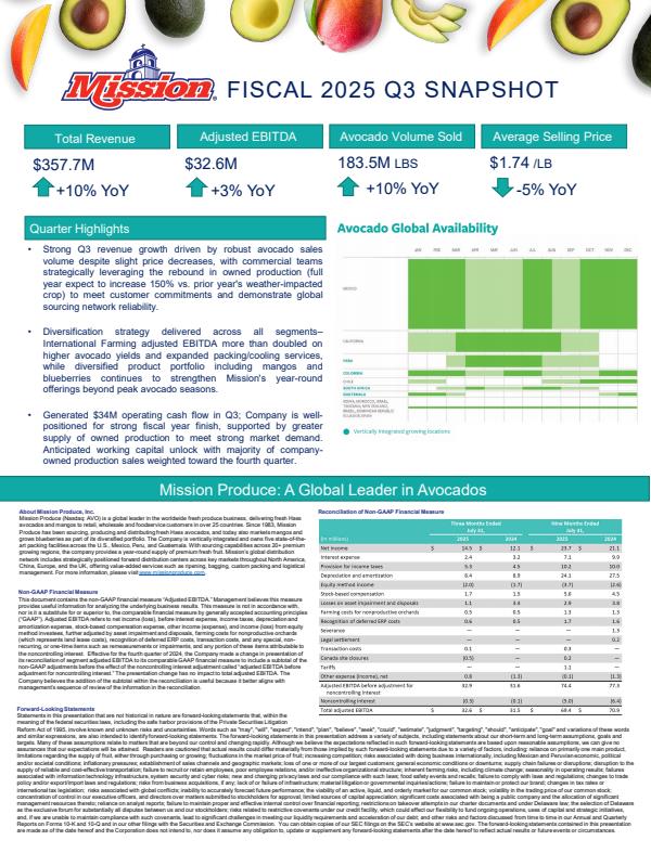 Mission Produce, Inc. engages in sourcing, producing, packaging, and distributing avocados in the United States and internationally. The company operates through two segments, Marketing and Distribution, and International Farming. It also provides value-added services, including ripening, bagging, custom packing, and logistical management. The company serves retail, wholesale, and foodservice customers. The company was founded in 1983 and is headquartered in Oxnard, California.