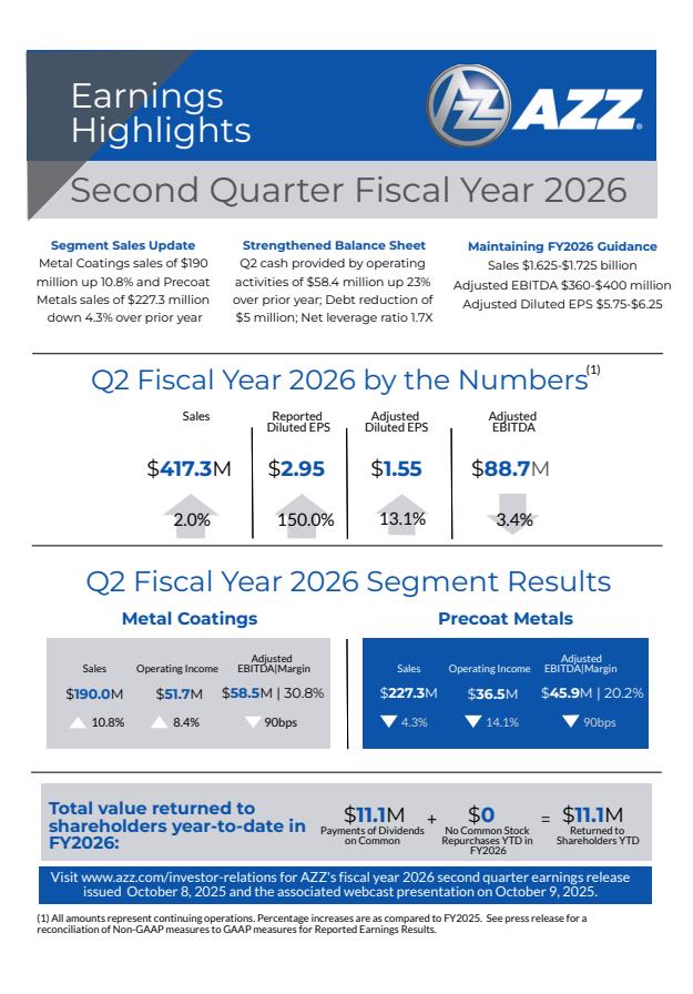 AZZ Inc. offers galvanizing and metal coating solutions, welding solutions, specialty electrical equipment, and engineered services to the power generation, transmission, distribution, refining, and industrial markets in the United States and internationally. The company operates through two segments, Infrastructure Solutions and Metal Coatings. The Metal Coatings segment offers metal finishing solutions for corrosion protection, including hot-dip galvanizing, spin galvanizing, powder coating, anodizing, and plating to the steel fabrication and other industries. It serves fabricators or manufacturers that provide services to the electrical and telecommunications, bridge and highway, petrochemical, and general industrial markets, as well as original equipment manufacturers. The Infrastructure Solutions segment provides products and services to support industrial and electrical applications. It offers custom switchgear, electrical enclosures, medium and high voltage bus ducts, explosion proof and hazardous duty lighting, and tubular products, as well as solutions and engineering resources to multi-national companies. This segment sells its products through internal sales force, manufacturers' representatives, distributors, and agents. The company was incorporated in 1956 and is headquartered in Fort Worth, Texas.