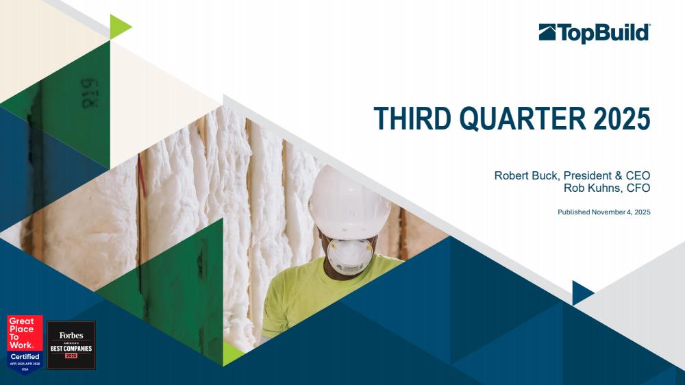 TopBuild Corp., together with its subsidiaries, engages in the installation and distribution of insulation and other building products to the construction industry. The company operates in two segments, Installation and Specialty Distribution. It provides insulation products and accessories, glass and windows, rain gutters, afterpaint products, fireproofing products, garage doors, fireplaces, closet shelving, roofing materials, and other products; and insulation installation services. The company also offers various services and tools to assist builders in applying the principles of building science to new home construction, which include pre-construction plan reviews, diagnostic testing, and various inspection services; and home energy rating services. In addition, it distributes building and mechanical insulation, insulation accessories, and other building product materials for the residential, commercial, and industrial end markets. The company serves single-family homebuilders, single-family custom builders, multi-family builders, commercial general contractors, remodelers, and individual homeowners, as well as insulation contractors, gutter contractors, weatherization contractors, other contractors, dealers, metal building erectors, and modular home builders. It operates approximately 235 installation branches and 175 distribution centers in the United States and Canada. The company was formerly known as Masco SpinCo Corp. and changed its name to TopBuild Corp. in March 2015. TopBuild Corp. was incorporated in 2015 and is headquartered in Daytona Beach, Florida.