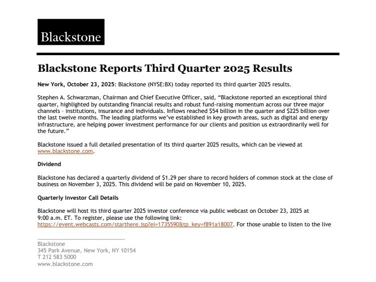 Blackstone Inc. is an alternative asset management firm specializing in real estate, private equity, hedge fund solutions, credit, secondary funds of funds, public debt and equity and multi-asset class strategies. The firm typically invests in early-stage companies. It also provide capital markets services. The real estate segment specializes in opportunistic, core+ investments as well as debt investment opportunities collateralized by commercial real estate, and stabilized income-oriented commercial real estate across North America, Europe and Asia. The firm's corporate private equity business pursues transactions throughout the world across a variety of transaction types, including large buyouts,special situations, distressed mortgage loans, mid-cap buyouts, buy and build platforms, which involves multiple acquisitions behind a single management team and platform, and growth equity/development projects involving significant majority stakes in portfolio companies and minority investments in operating companies, shipping, real estate, corporate or consumer loans, and alternative energy greenfield development projects in energy and power, property, dislocated markets, shipping opportunities, financial institution breakups, re-insurance, and improving freight mobility, financial services, healthcare, life sciences, enterprise tech and consumer, as well as consumer technologies. The firm considers investment in Asia and Latin America. It has a three year investment period. Its hedge fund business manages a broad range of commingled and customized fund solutions and its credit business focuses on loans, and securities of non-investment grade companies spread across the capital structure including senior debt, subordinated debt, preferred stock and common equity. Blackstone Inc. was founded in 1985 and is headquartered in New York, New York with additional offices across Asia, Europe and North America.