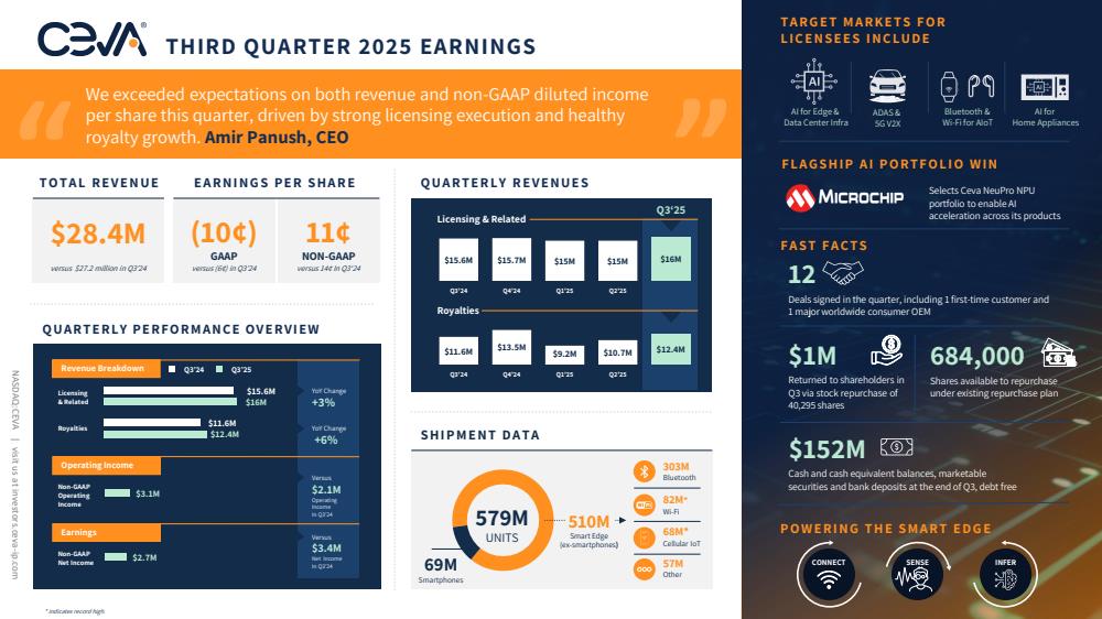 CEVA, Inc. operates as a licensor of wireless connectivity and smart sensing technologies to semiconductor and original equipment manufacturer (OEM) companies worldwide. It designs and licenses various digital signal processors, AI processors, wireless platforms, and complementary software for sensor fusion, image enhancement, computer vision, voice input, and artificial intelligence (AI). The company licenses a family of wireless connectivity and smart sensing technologies, and integrated IP solutions, including DSP-based platforms for 5G baseband processing in mobile, IoT, and infrastructure; imaging and computer vision for any camera-enabled devices; audio/voice/speech and ultra-low power always-on/sensing applications for multiple IoT markets; sensor fusion software and inertial measurement unit solutions for hearables, wearables, AR/VR, PC, robotics, remote controls, and IoT; and wireless IoT for Bluetooth, Wi-Fi 4/5/6/6E, Ultra-wideband (UWB), and NB-IoT. Its technologies are licensed to companies, which design, manufacture, market, and sell application-specific integrated circuits and application-specific standard products to mobile, consumer, automotive, robotics, industrial, aerospace and defense, and IoT companies for incorporation into various end products. The company delivers its DSP cores, platforms, and AI processors in the form of a hardware description language definition; and offers development platforms, software development kits, and software debug tools that facilitate system design, debug, and software development. The company licenses its technology through a direct sales force. The company was formerly known as ParthusCeva, Inc. and changed its name to CEVA, Inc. in December 2003. CEVA, Inc. was incorporated in 1999 and is headquartered in Rockville, Maryland.