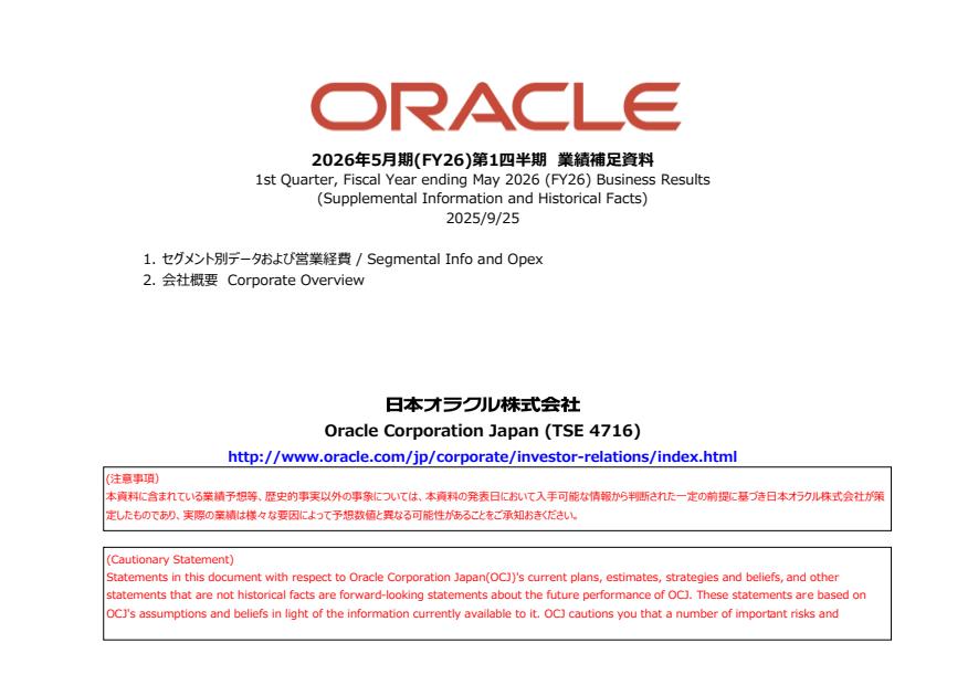 Oracle Japan (4716) is a subsidiary of Oracle Corporation, a global leader in database software and technology, cloud-engineered systems, and enterprise software products. Oracle Japan provides a comprehensive suite of cloud-based and on-premises solutions, including database management systems, enterprise resource planning (ERP) software, customer relationship management (CRM) platforms, and supply chain management applications. The company serves a diverse range of industries, offering technologies that help businesses streamline operations, improve customer experiences, and drive digital transformation.