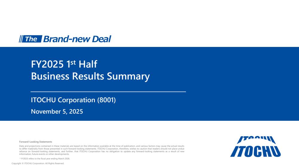 ITOCHU Corporation engages in trading and importing/exporting various products worldwide. The company's Textile segment produces and sells fiber and garment materials, textiles fabrics, apparel, and industrial materials; and imports lifestyle brands, fashion accessories, and garments in various areas, such as luxury, casual, and sports. Its Machinery segment provides engineering, procurement, and construction services; operates water and environmental, infrastructure, renewable energy, oil and gas, petrochemical, and independent power producer projects and plants; sells and leases aircraft and related equipment; sells automobiles, construction machinery, electronic systems, industrial machinery, and medical devices; and owns and charters ships. The company's Metals & Minerals segment engages in mining and trading of iron ore, coal, uranium, base metals, and minor metals; trading in non-ferrous metal materials; and processing and trading in steel products. Its Energy & Chemicals segment trades in crude oil, petroleum products, LPG, LNG, natural gas, hydrogen, organic and inorganic chemicals, synthetic resins, household goods, fine chemicals, pharmaceuticals, and electronic materials, as well as generates and trades in power. The company's Food segment produces, distributes, and retails food products. Its General Products & Realty segment produces and sells paper, pulp, natural rubber, tire, and wood products and materials; develops and operates real estate properties, such as housing, logistics facilities, and other projects; and offers logistics services. The company's ICT & Financial Business segment offers IT solutions, Internet related and venture capital services, mobile telephone equipment and services, BPO, broadcasting and communications, entertainment and content services, outsourcing services for healthcare and preventive medicine, and financial and insurance brokerage services. The company was founded in 1858 and is headquartered in Tokyo, Japan.