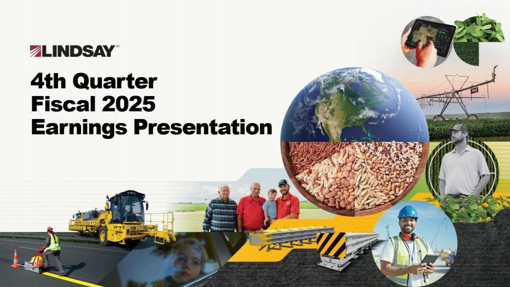 Lindsay Corporation, together with its subsidiaries, provides water management and road infrastructure products and services in the United States and internationally. The company operates in two segments, Irrigation and Infrastructure. The Irrigation segment manufactures and markets center pivot, lateral move irrigation systems, and irrigation controls under the Zimmatic brand; hose reel travelers under the Perrot and Greenfield brands; and chemical injection systems, variable rate irrigation systems, flow meters, weather stations, soil moisture sensors, and remote monitoring and control systems under the GrowSmart brand. It also offers repair and replacement parts for its irrigation systems and controls; global positioning system positioning and guidance, variable rate irrigation, wireless irrigation management, irrigation scheduling, and smartphone applications; and industrial Internet of Things technology solutions, data acquisition and management systems, and custom electronic equipment for applications under the Elecsys brand. The Infrastructure segment provides Quickchange moveable barrier systems that help in highway reconstruction, paving and resurfacing, road widening, median and shoulder construction, and tunnels and bridge repairs; and re-directive and non-re-directive crash cushions, which are used to enhance highway safety at locations, such as toll booths, freeway off-ramps, medians and roadside barrier ends, bridge supports, utility poles, and other fixed roadway hazards. It also offers specialty barrier products; road marking and road safety equipment; and railroad signals and structures, and diameter steel tubing products, as well as outsourced manufacturing and production services for other companies. The company serves departments of transportation, municipal transportation road agencies, roadway contractors, subcontractors, distributors, and dealers. Lindsay Corporation was founded in 1954 and is headquartered in Omaha, Nebraska.