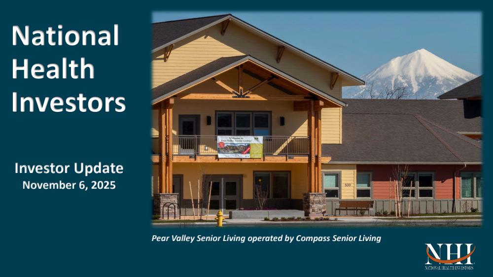 Incorporated in 1991, National Health Investors, Inc. (NYSE: NHI) is a real estate investment trust specializing in sale-leaseback, joint-venture, mortgage and mezzanine financing of need-driven and discretionary senior housing and medical investments. NHI's portfolio consists of independent, assisted and memory care communities, entrance-fee retirement communities, skilled nursing facilities, medical office buildings and specialty hospitals.