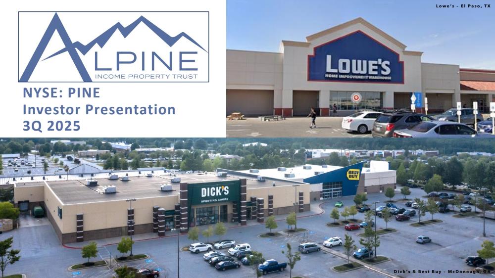 Alpine Income Property Trust, Inc. (NYSE: PINE) is a publicly traded real estate investment trust that acquires, owns and operates a portfolio of high-quality single-tenant net leased commercial income properties.