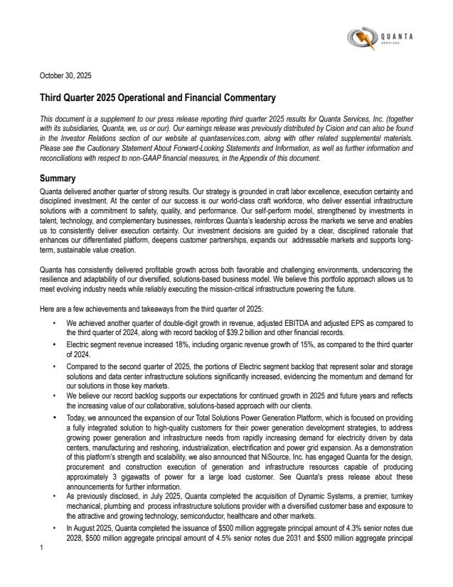 Quanta Services, Inc. provides specialty contracting services worldwide. The Electric Power Infrastructure Solutions segment engages in the design, procurement, construction, upgrade, repair, and maintenance of electric power transmission and distribution infrastructure and substation facilities; energized installation, maintenance, and upgrade of electric power infrastructure projects; installation of smart grid technologies on electric power networks; and design, installation, maintenance, and repair of commercial and industrial wirings. This segment also offers aviation services; emergency restoration services; and other engineering and technical services; design and construction solutions to wireline and wireless communications, cable multi-system operators, and other customers; and training for electric workers, as well as training for the gas distribution and communications industries. The Renewable Energy Infrastructure Solutions segment is the involved in engineering, procurement, construction, upgrade, repair, and maintenance services to renewable generation facilities, such as wind, solar, and hydropower generation facilities, as well as battery storage facilities; and provision of engineering and construction services for substations and switchyards, transmission, and other electrical infrastructures. The Underground Utility and Infrastructure Solutions segment offers design, engineering, construction, upgrade repair, and maintenance services to customers involved in the transportation, distribution, storage and processing of natural gas, oil, and other products; fabrication of pipeline support systems and related structures and facilities; and engineering and construction of pipeline and storage systems, and compressor and pump stations. The company was formerly known as Fabal Construction, Inc. and changed its name to Quanta Services, Inc. in November 1997. Quanta Services, Inc. was incorporated in 1997 and is headquartered in Houston, Texas.